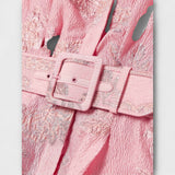 עיצוב: שמלה זו כוללת דוגמת פרחים מורכבת בגוון ורוד אלגנטי, עם מותן מודגשת ושרוולים קצרים.